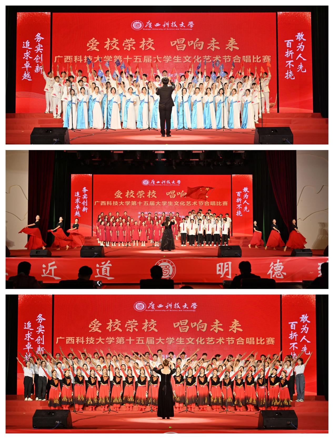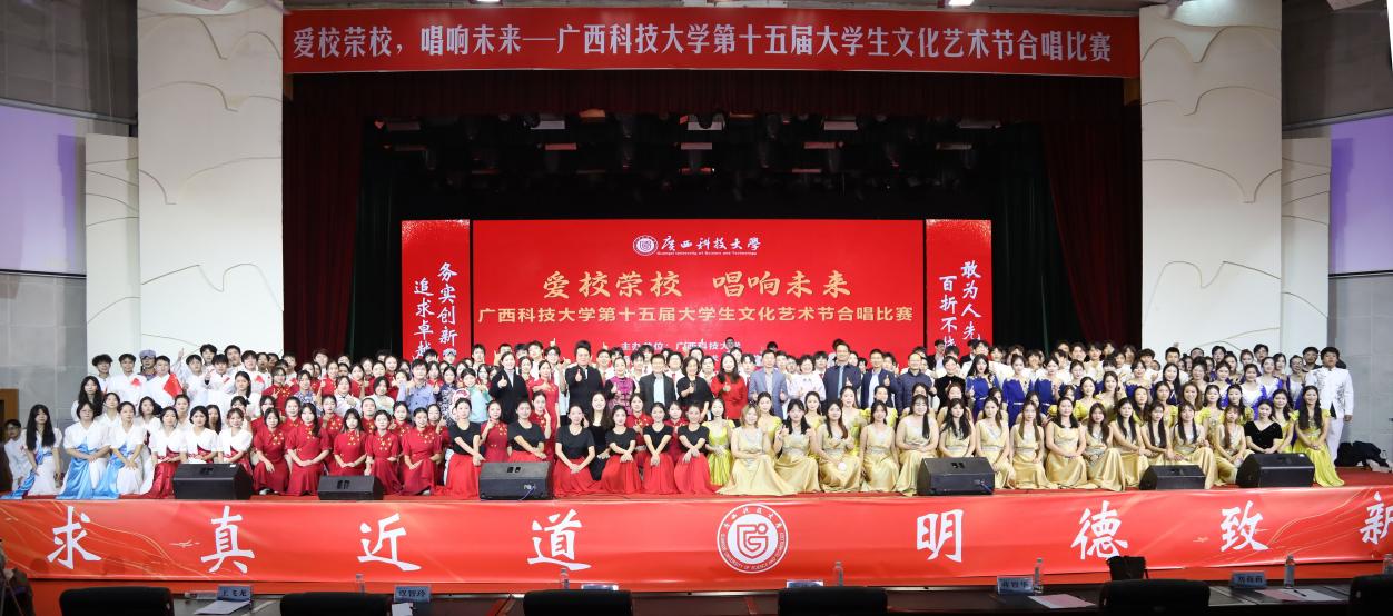 12月11日晚,学校第十五届大学生文化艺术节“爱校荣校,唱响未来”合唱比赛在文昌校区大礼堂举行,本次比赛由人文艺术与设计学院承办。学校党委副书记宾月景以及相关职能部门负责人与广大师生代表一同观看了比赛。比赛由自治区音协副主席、柳州市文联副主席、柳州市音协主席李燕等5名专家教授担任评委。