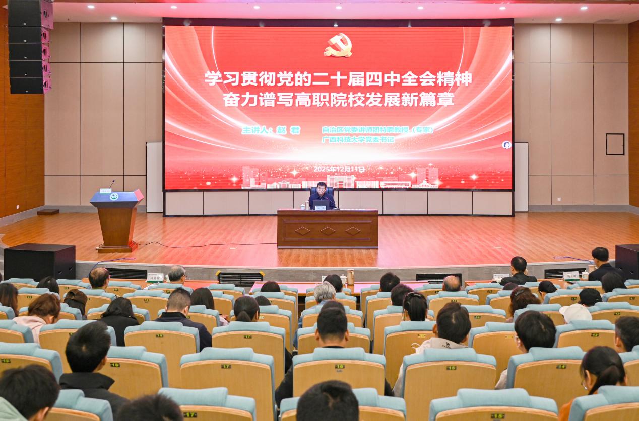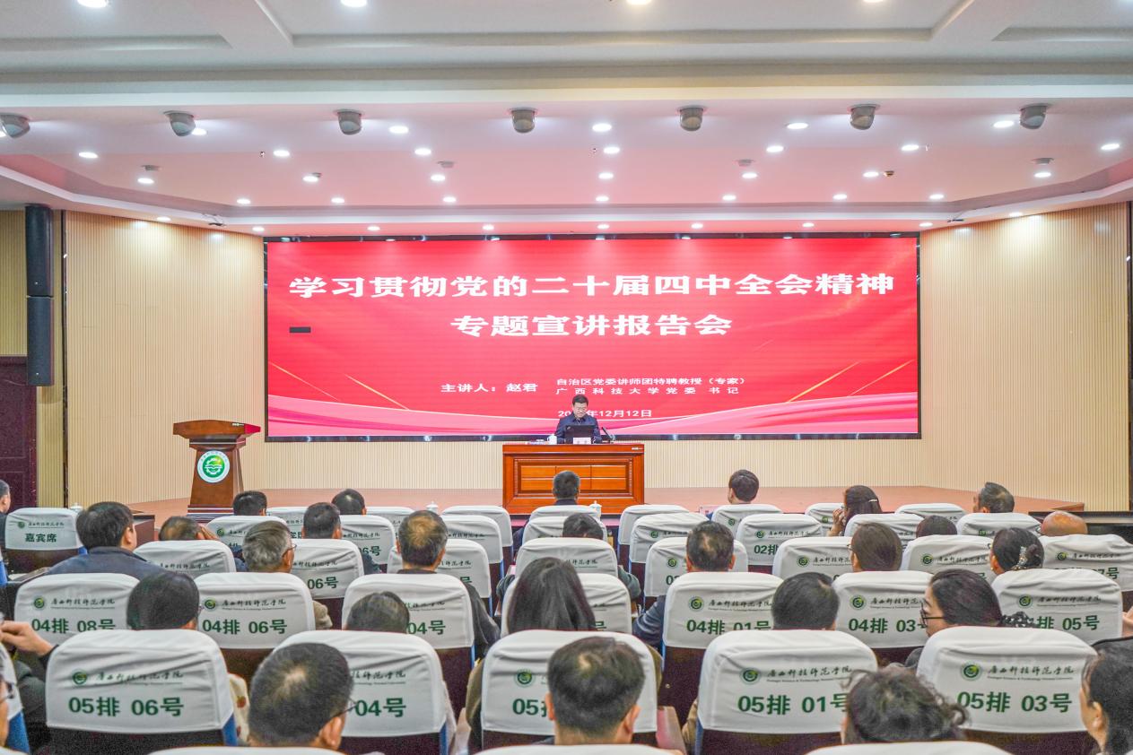 12月11日至12日,根据自治区党委教育工委的统一安排,自治区党委讲师团特聘教授(专家)、自治区第十二次党代表大会代表、学校党委书记赵君教授先后到广西生态工程职业技术学院、广西科技师范学院宣讲党的二十届四中全会精神。报告会分别由广西生态工程职业技术学院党委书记冯昌信、广西科技师范学院党委书记杨杰主持。两所高校的领导干部以及师生代表分别参加报告会。
