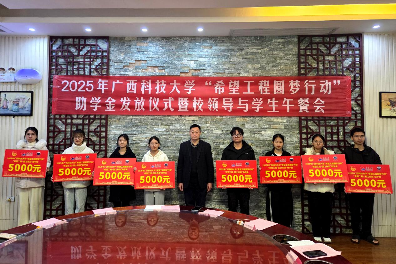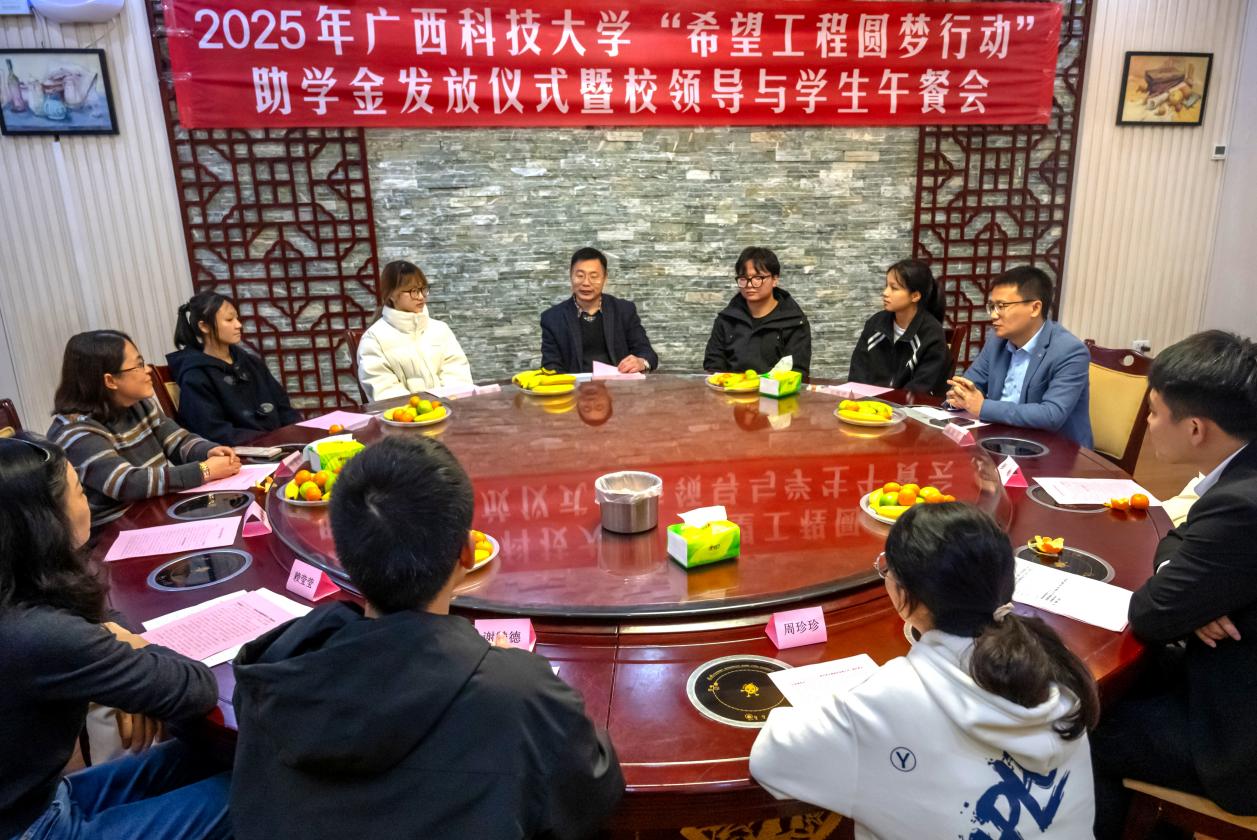 12月24日,2025年广西科技大学“希望工程圆梦行动”助学金发放仪式暨校领导与学生午餐会在文昌校区“科小螺”螺蛳粉体验中心举行。学校党委副书记宾月景出席活动。学工部(处)、团委相关负责同志和受资助的8名2025级新生参加活动。活动由学校团委书记蒋智华主持。