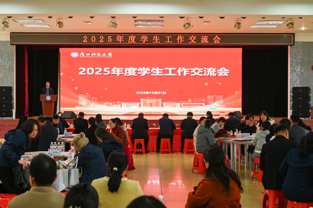12月31日下午,学校在文昌校区大学生活动中心举行2025年度学生工作交流会。学校党委副书记宾月景出席交流会并对各学院(部)学生工作进行点评。学工部(处)、团委全体人员、研工部(院)负责人、各二级学院(部)分管学生工作的党委副书记以及全体辅导员参会。
