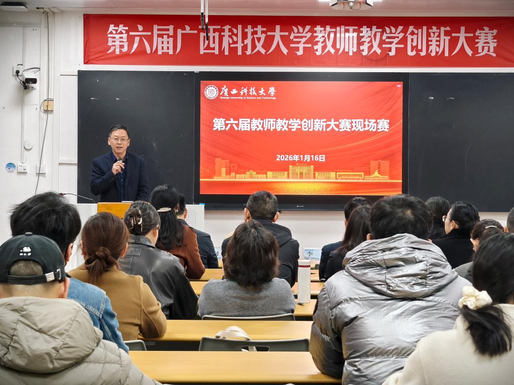 1月16日,第六届广西科技大学教师教学创新大赛现场赛开幕式在文昌校区5南402室举行。学校党委常委、副校长李健出席现场赛开幕式并讲话。