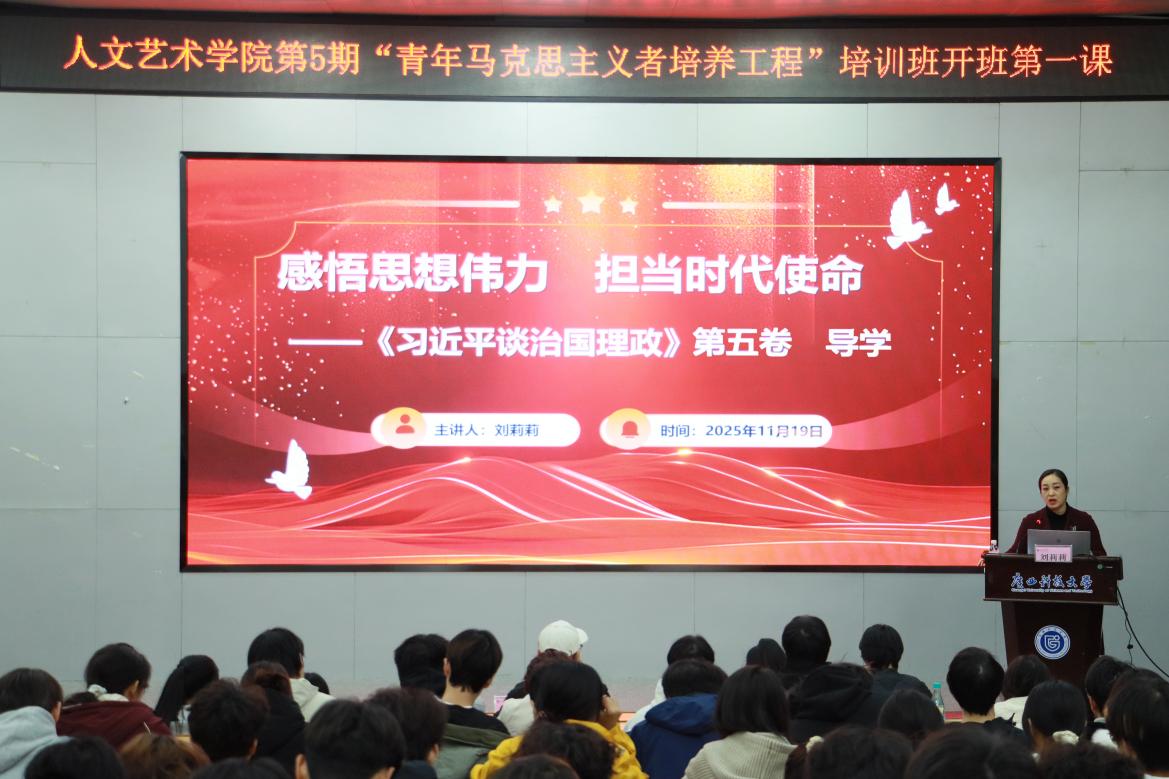 11月19日晚,人文艺术与设计学院第5期“青年马克思主义者培养工程”培训班开班仪式暨开班第一课在文昌校区图书馆报告厅举行。学院党委书记刘莉莉、党委副书记兼纪委书记沙磊,全体辅导员及250余名学员参会,仪式由学院学工办主任、团委书记付玉立主持。