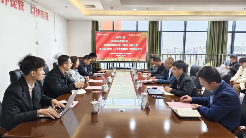 11月27日上午,华为机器有限公司设备制造管理部高级经理赵雪峰、中南国际科技发展(深圳)有限公司运营总监黄威一行到自动化学院考察交流,商讨校企合作事项。双方在柳东校区学院会议室举行座谈交流会。学校教务处副处长姜峰、自动化学院全体领导班子成员以及各系教师代表参会。会议由学院党委书记彭勇主持。与会人员围绕“红链筑基·红芯育人”校企合作办学模式创新、人才联合培养路径优化、课程管理与产业需求对接、实习实践基地共建等议题,展开深入交流讨论。