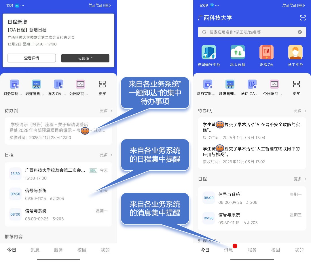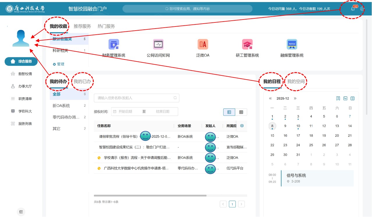 近日,网络中心在全面实现统一身份认证的基础上,依托数据治理与数据中台建设打造数智底座,创新采用“微服务、微待办、微消息”三微驱动模式实现“无微不至”的线上服务,实现线上业务办理直通车,精准聚焦“师生中心”,精心打造个人工作空间——将所有业务信息系统拉通,各种事务待办、消息通知、日程提醒、个人课表、图书借阅、办公邮箱、工资补助、个人云盘等教师高频使用的服务信息一屏聚合呈现,实现服务需求 “单点登录、一站式查看、一触即达、一体化管理”,从“人找服务”到“服务找人”的智慧转型。