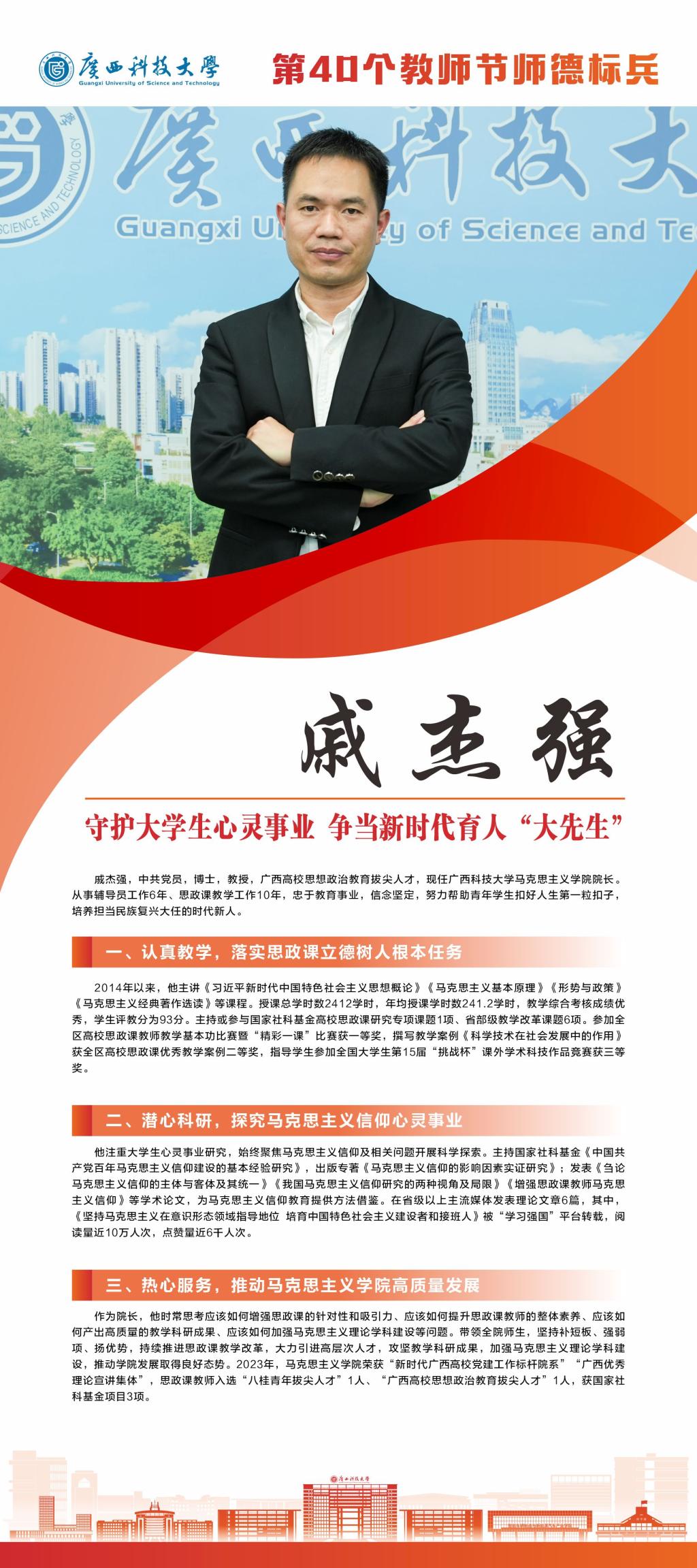 值我国第40个教师节来临之际,为全面贯彻新时代党的教育方针,落实立德树人根本任务,大力弘扬教育家精神,激励全校教职工爱岗敬业、锐意进取,不断提升教育教学和管理服务水平,营造尊师重教良好风尚,近日,学校评选并表彰了一批第40个教师节师德标兵、优秀教师、优秀教育工作者、优秀辅导员。根据《中共广西科技大学委员会关于表彰第40个教师节师德标兵、优秀教师、优秀教育工作者、优秀辅导员的决定》(科大党发〔2024〕68号)精神,决定对蔡亮等10名师德标兵、郑伟光等10名优秀教师、卢志平等10名优秀教育工作者、王俊辉等8名优秀辅导员进行表彰。