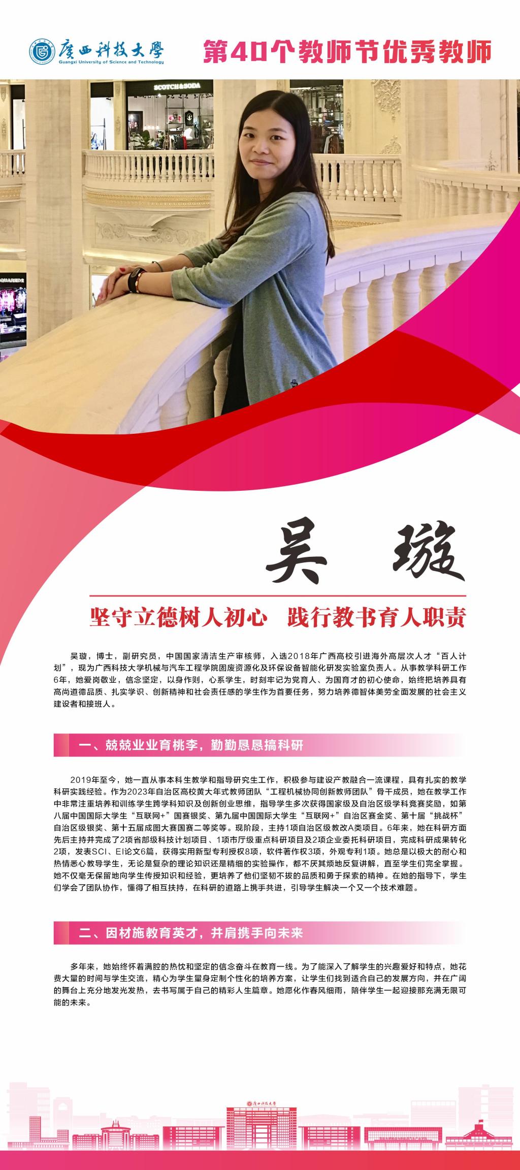 接下来,我们将推出系列报道,为大家介绍我校这些优秀教师。今天就让我们一起走近学校“优秀教师”吴璇吧。