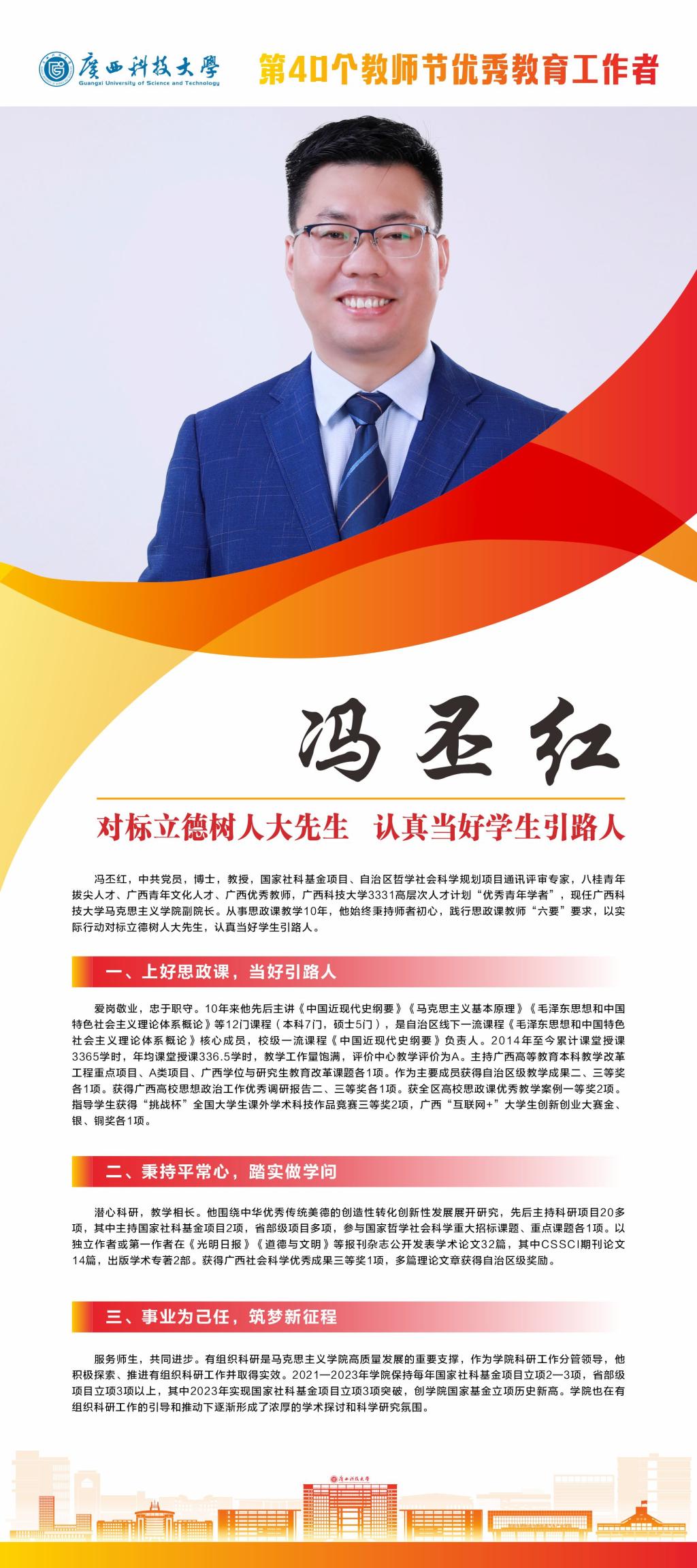 值我国第40个教师节来临之际,为全面贯彻新时代党的教育方针,落实立德树人根本任务,大力弘扬教育家精神,激励全校教职工爱岗敬业、锐意进取,不断提升教育教学和管理服务水平,营造尊师重教良好风尚,近日,学校评选并表彰了一批第40个教师节师德标兵、优秀教师、优秀教育工作者、优秀辅导员。根据《中共广西科技大学委员会关于表彰第40个教师节师德标兵、优秀教师、优秀教育工作者、优秀辅导员的决定》(科大党发〔2024〕68号)精神,决定对蔡亮等10名师德标兵、郑伟光等10名优秀教师、卢志平等10名优秀教育工作者、王俊辉等8名优秀辅导员进行表彰。
