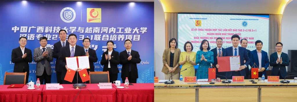 与越南河内工业大学、泰国诗纳卡琳威洛大学建立了汉语、英语本科专业“2 2”“3 1”联合培养项目。其中,“广西科技大学与河内工业大学汉语本科2 2联合培养项目”是中国与越南高校首个本科学位联授项目。学校获得“广西高校来华留学教育进步最快单位”“汉语水平考试(hsk)网考优秀考点”“中国—东盟教育开放合作试验区来桂留学基地培育学校”等荣誉称号。