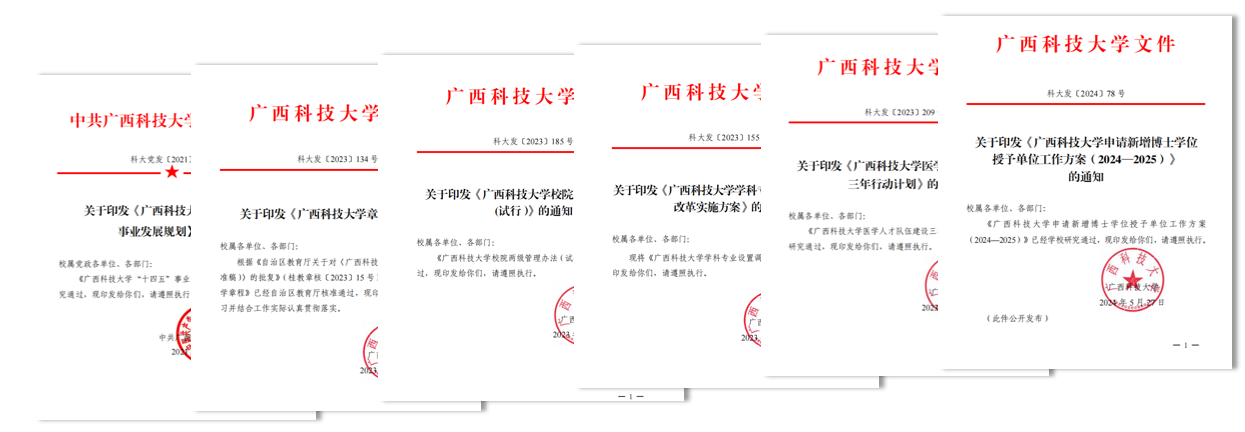综合研判新时代高等教育发展新形势、新任务和学校内外发展环境,高标准、高质量完成了《广西科技大学“十四五”事业发展规划》及12个专项规划、20个学院(部)规划的编制工作,形成科学完备、统一衔接的规划体系。顺利完成《广西科技大学章程》修订,为学校高质量发展提供重要保障。组织制定《广西科技大学校院两级管理办法(试行)》及其配套文件,进一步理顺和完善了校院两级管理模式。制定《广西科技大学学科专业设置调整优化改革实施方案》《广西科技大学学科带头人和学术带头人管理办法(试行)》《广西科技大学一流学科建设管理办法(试行)》,明确了学校学科建设的总体目标,进一步规范了学科建设管理体制。