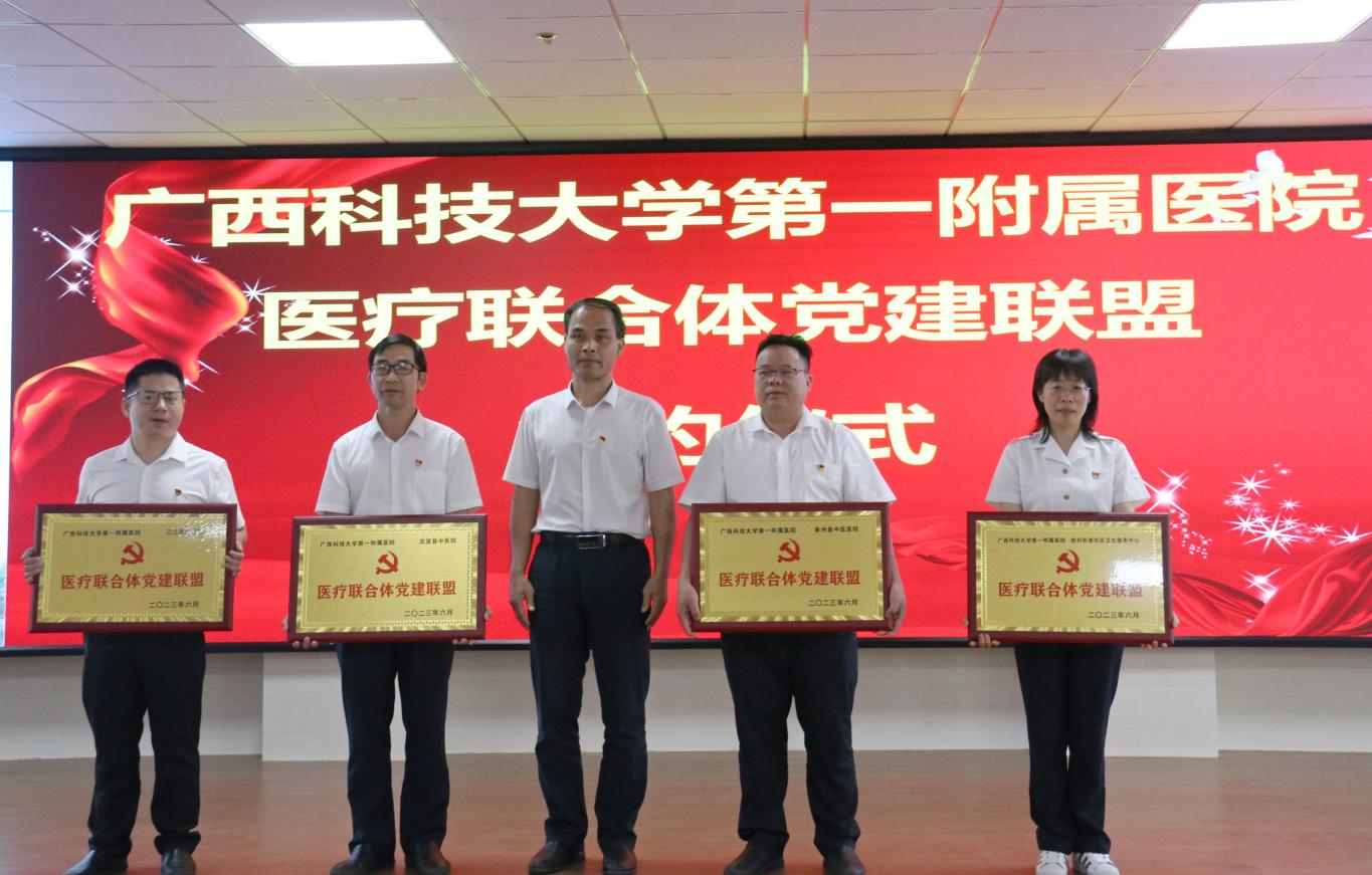 医院党委始终坚持以习近平新时代中国特色社会主义思想为指导,深入学习宣传贯彻党的二十大和二十届一中、二中、三中全会精神以及习近平总书记关于广西工作论述的重要要求,扎实开展党史学习教育、学习贯彻习近平新时代中国特色社会主义思想主题教育、党纪学习教育,以全面推进清廉医院建设为抓手,全面落实党委领导下的院长负责制,确定《党支部参与科室重大事项决策制度》内容,印发实施《清廉医院建设提质增效三年行动实施方案(2024—2026年)》等方案,坚定不移强化政治引领。2022年,医院党委制定下发《广西科技大学第一附属医院医联体党建联盟共建工作实施方案》,2023年,医院分别与三江侗族自治县三江民族医院、武宣县中医院、象州县中医医院、柳州市柳北区胜利街道社区卫生服务中心签订医联体党建联盟共建协议并授牌。