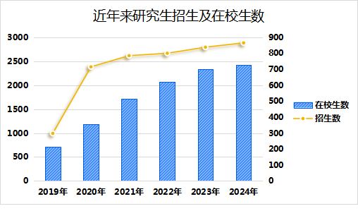 高度重视学位点建设,积极争取研究生招生指标,五年来,新增硕士学位一级学科5个,专业学位授权类别10个,招生规模增长1.9倍,在校生规模增长2.4倍,现有在校生规模2418人。有组织开展校内外招生宣讲、线上直播宣讲、组织参加研招现场咨询会等宣传活动,做好官微、网站信息推送、互联网组群不间断交流等服务措施,研究生生源质量稳步提升。学校研究生招生第一志愿录取率近5年提升了6倍,其中本校应届生第一志愿报考本校录取人数增长了8.9倍。